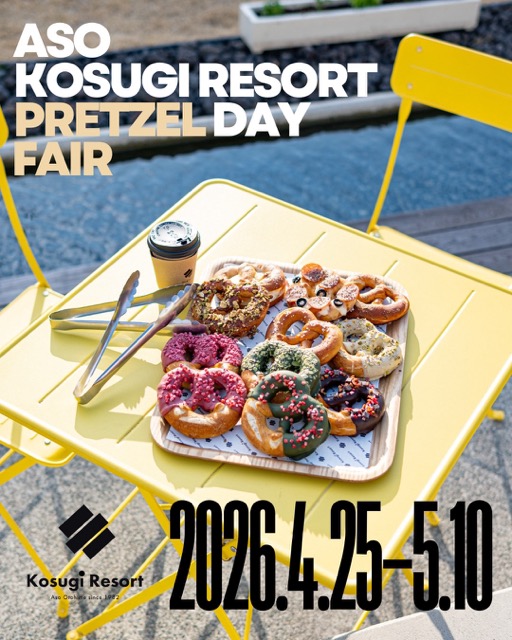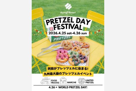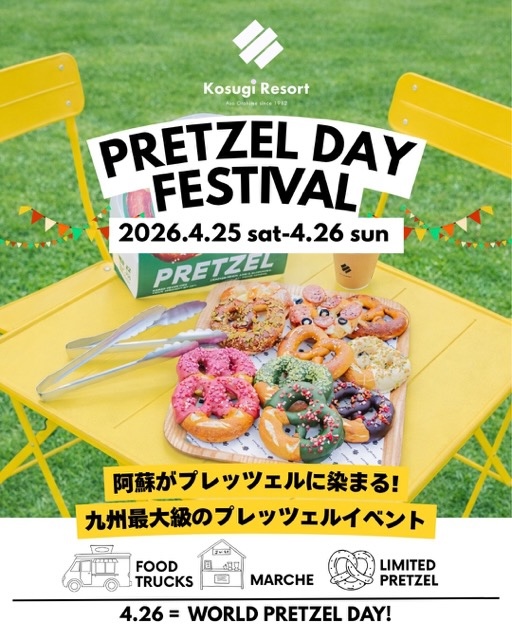 熊本県阿蘇市の「Kosugi Resort(コスギリゾート)」は、2026年4月25日(土)・26日(日)の2日間、「PRETZEL DAY FESTIVAL(プレッツェルデイ フェスティバル)」を開催する。あわせて4月25日から5月10日まで「PRETZEL DAY FAIR(プレッツェルデイ フェア)」も実施され、ゴールデンウィーク期間を通じて限定プレッツェルが楽しめる。