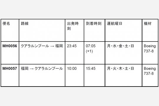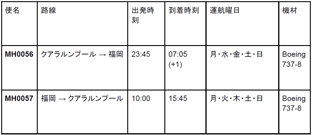 マレーシア航空は、2026年9月2日よりクアラルンプール(KUL)と福岡(FUK)を結ぶ直行便の運航を再開する。週5便(福岡発:月・火・木・土・日)の運航を予定しており、同社が日本で就航する都市として東京、大阪に次ぐ3番目の路線となる。機材はボーイング737-8型機。MH0057便は、福岡を10:00に出発してクアラルンプールに15:45に到着する。MH0056便は、クアラルンプールを23:45に出発し、福岡には翌日07:05に到着する。