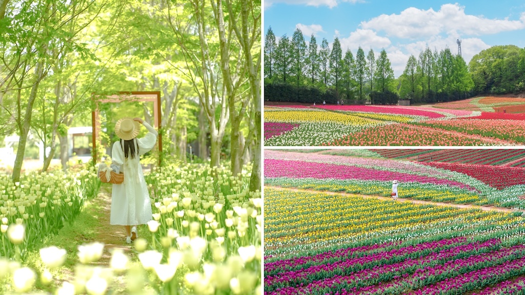 世羅高原農場の「チューリップ祭」では、65,000平方メートルの広大な畑に75万本のチューリップが咲き広がる。品種・エリアごとに開花時期をずらして植栽しており、来園のタイミングによって色や景観の変化を楽しめる。4月16日時点ですでに見頃を迎えているエリアがあり、これから開花を迎えるエリアも残っている。入園料は開花状況により変動し、大人700〜1,200円、小人(4歳〜小学生)300〜600円。